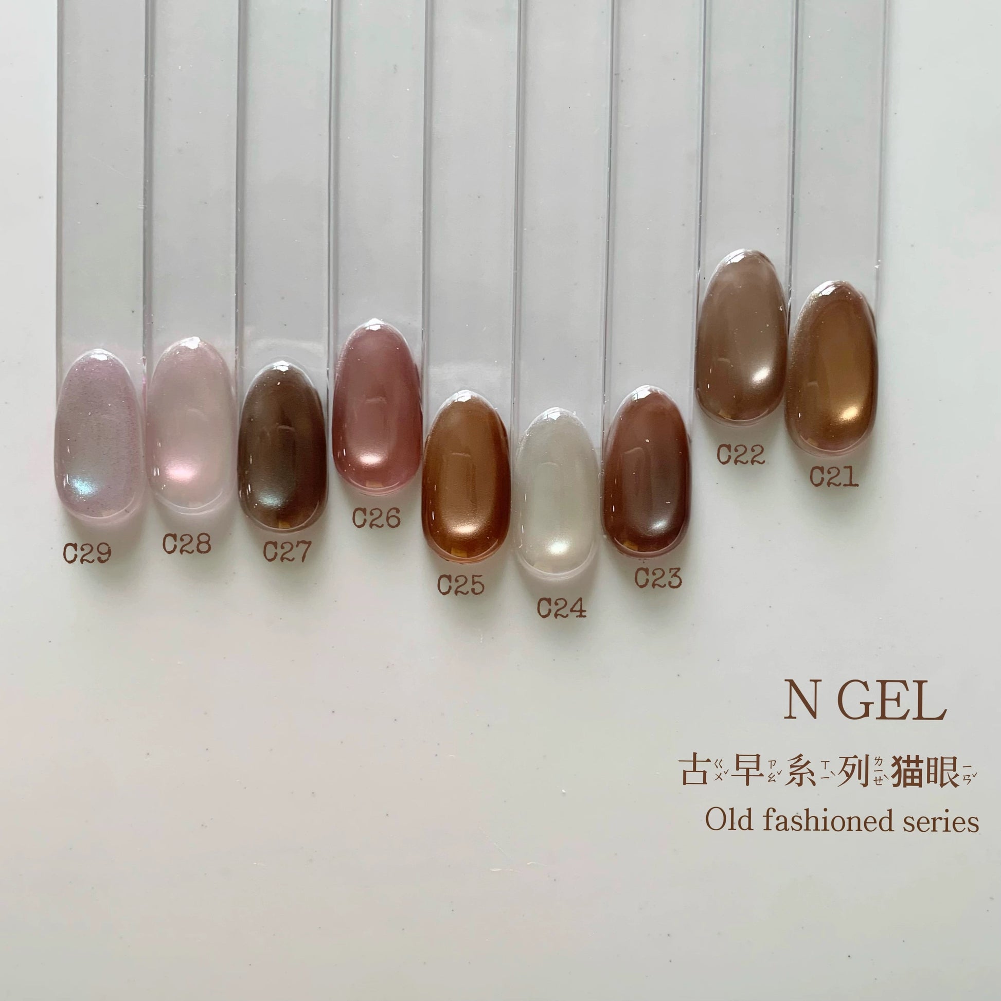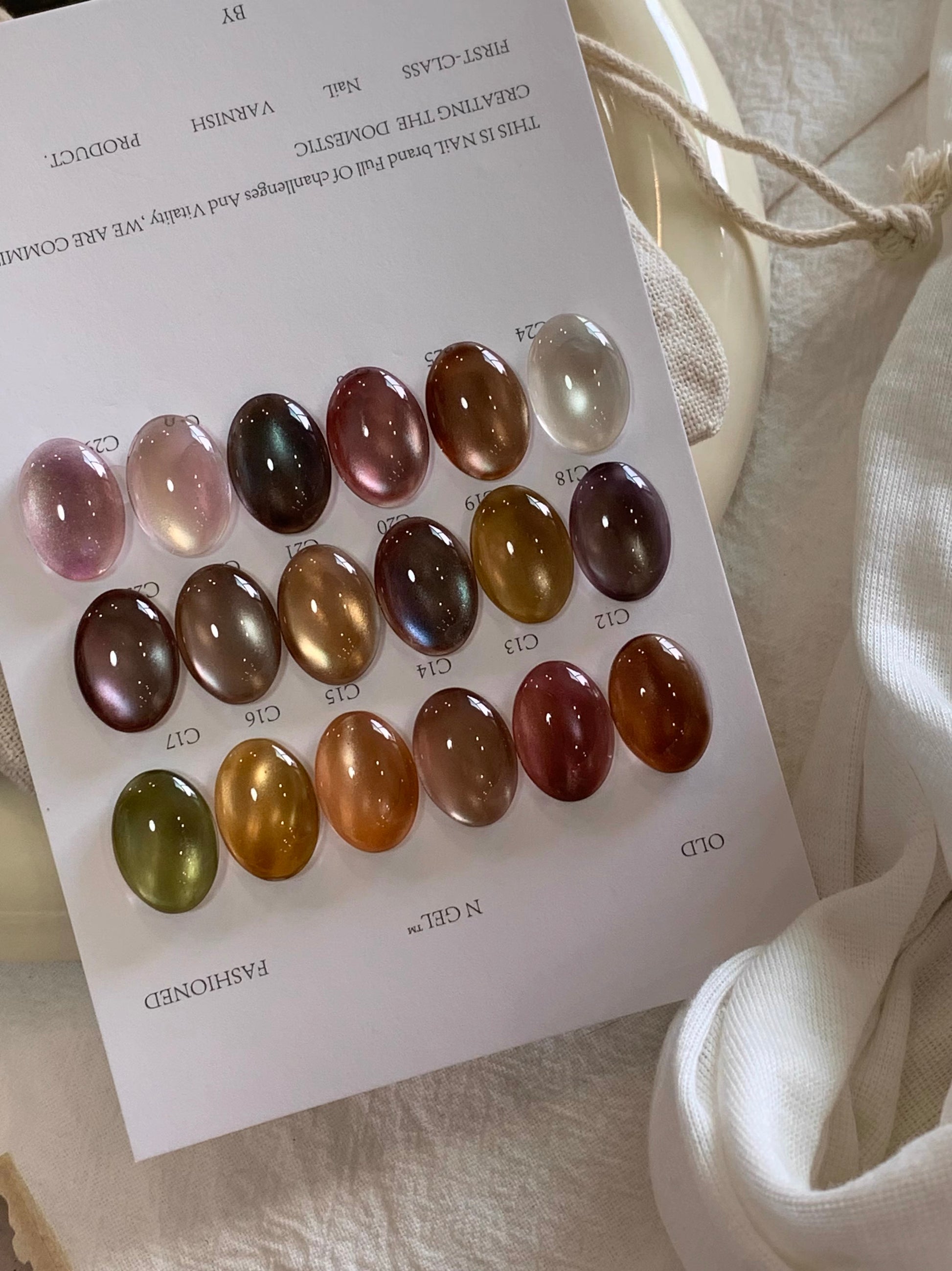 Inspired by nostalgic autumn tones, the N GEL Old Fashioned Cat Eye Series features 18 elegant translucent magnetic shades that blend vintage depth with modern radiance. Each color captures the warmth of aged amber, rosewood, olive, and caramel — enhanced with a luminous cat-eye shimmer for that soft, reflective glow.